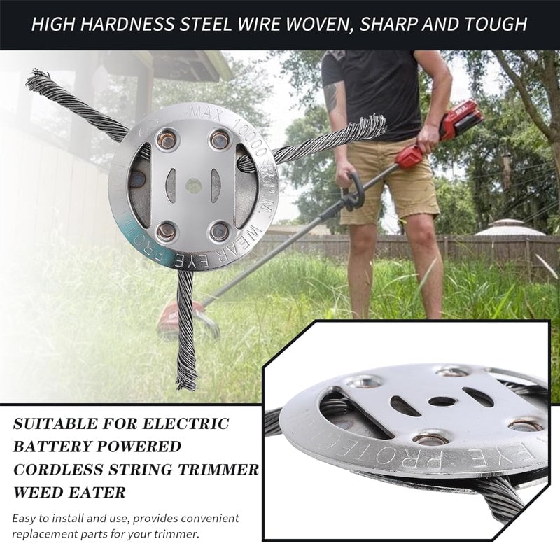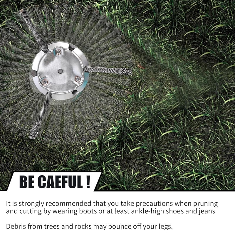 This wire weed blade head has been inspected for performance, safety and quality. Wear safety equipment before using the steel wire weed trimmer head. Appropriate protective clothing and safety glasses must be worn.